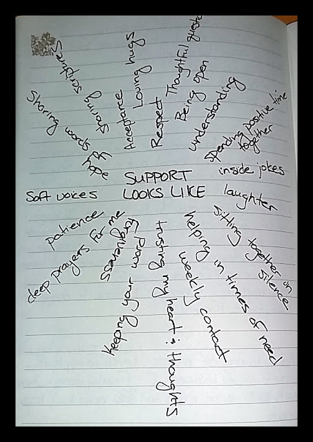 Below is a copy of my answers to the exercise. I took 5 minutes and tried not to over-think, too much. HA. I hope to be able to find out what "support looks like" to my family and friends too! For me, the most surprising things that came to mind were: thoughtful questions (you know, those that dig deeper than 'how are you doing?') soft voices, sitting together in silence, and inside jokes.